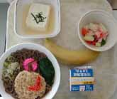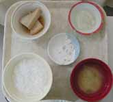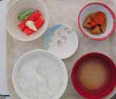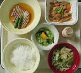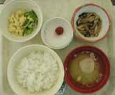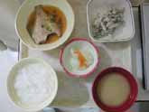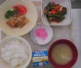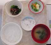 17時30分 夕食 全粥、煮魚(ニシン) 茄子とガンモの含め煮 みそ汁(大根、油揚げ) 酢物(ハルサメ、もやし、きゅうり) |